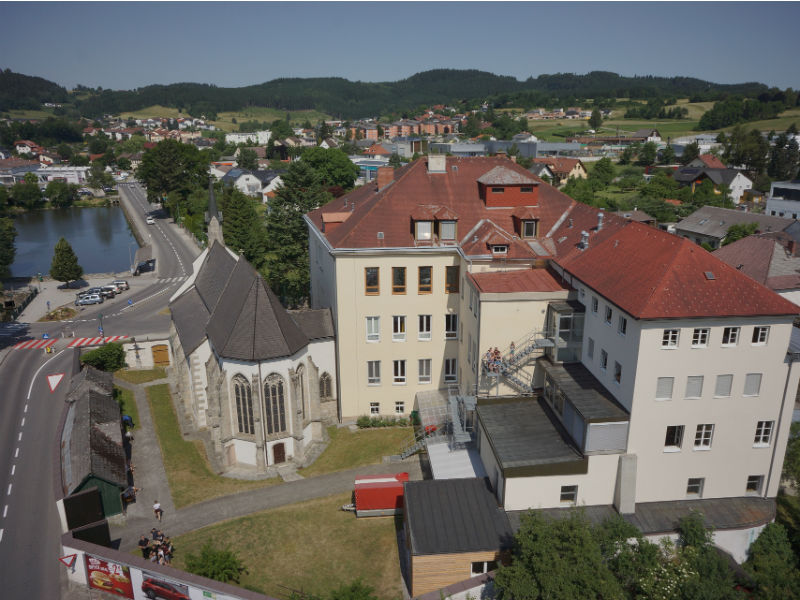 Nach einer ausführlichen Einschulung durch Christoph Kelderer ging es dann gleich zur Sache. Vom Schulhof aus wurde die 12kg schwere Drohne auf den Weg geschickt. Insgesamt drei Leute waren nötig, um Drohne, Kamera und Fotoapparate zu steuern, während das brummende Ding seine Bahnen über den Köpfen der begeisterten Schüler und Kollegen zog. Es entstanden atemberaubende Luftaufnahmen in 4K-Technik von der HLW Freistadt aus einer völlig neuen Perspektive. „So haben wir unsere Schule noch nie gesehen!“, waren sich die Schüler und Schülerinnen der HLK einig.