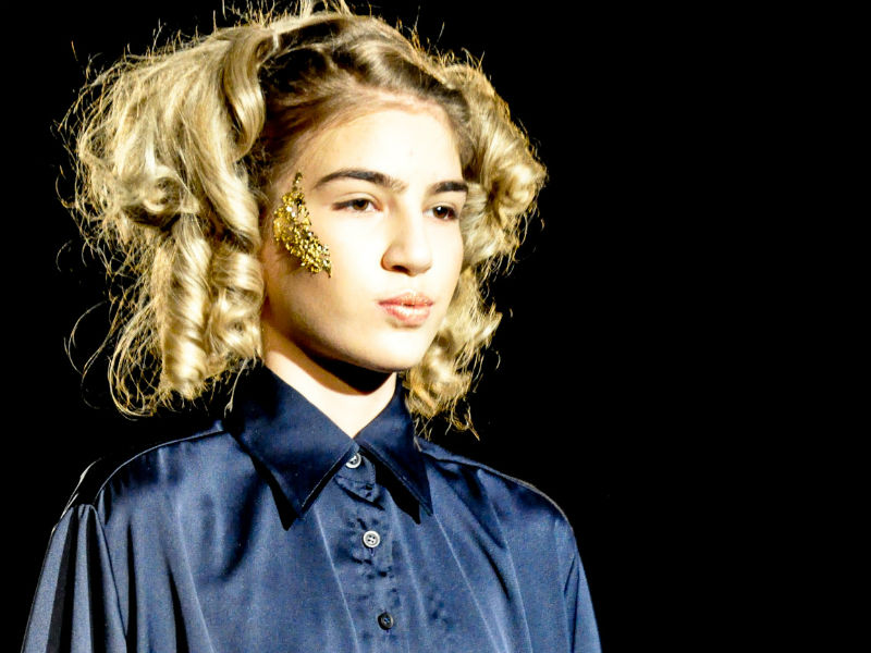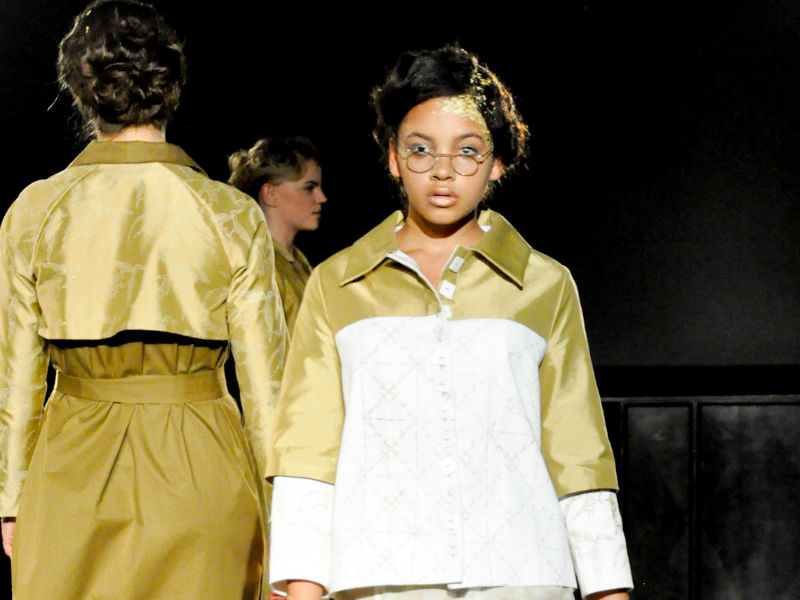 Grund genug, das heurige Modeevent unserer Schule unter dem Motto „Jugendstilakademie“ nicht nur im passenden Ambiente des Wilhelm Exner-Saales abzuhalten, sondern auch Kreationen vorzuführen, die in ihrem Design an die Zeit des Fin de Siècle erinnern. Viele Modelle wurden aus Stoffen gefertigt, die von den Schüler/innen im Siebdruckverfahren bedruckt, bzw. mit Gold und Silber handbemalt wurden. Kunstvoll gestylt, mit Blattgoldornamenten im Gesicht, wurden die Models von der Friseurschule Blue Angel Vienna.