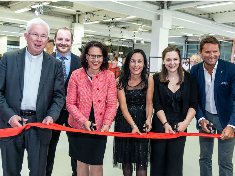 Visual_Merchandising_1: Eröffnung der Visual Merchandising Ausstellung durch Erzbischof Dr. Franz Lackner, Michael Wilhelmstötter (Lehrer Modeschule Hallein), Landtagsabgeordnete Mag. Daniela Gutschi, Schulleiterin Mag. Michaela Joeris, Simone Hirnsperger (Schülerin des Abschlussjahrgangs Visual Merchandising) und Markus Oberhamberger (Geschäftsführer Brandboxx Salzburg)