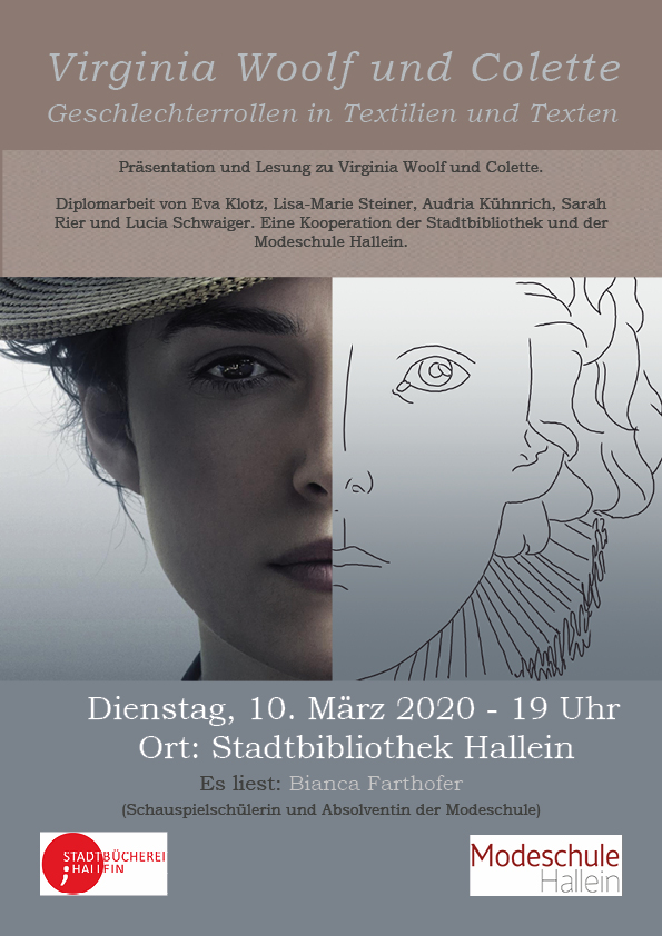 Bianca Farthofer, Schauspielschülerin und Absolventin der Modeschule Hallein, entführte am 10. März 2020 bei einer Lesung in der Stadtbücherei Hallein in die Welt von Virginia Woolf und Colette. Diese beiden Autorinnen bildeten den literarischen Rahmen für eine Diplomarbeit von Sarah Rier, Lucia Schwaiger, Lisa-Marie Steiner, Audria Kühnrich und Eva Klotz, die Modelle in Auseinandersetzung mit Geschlechterrollen entworfen haben.